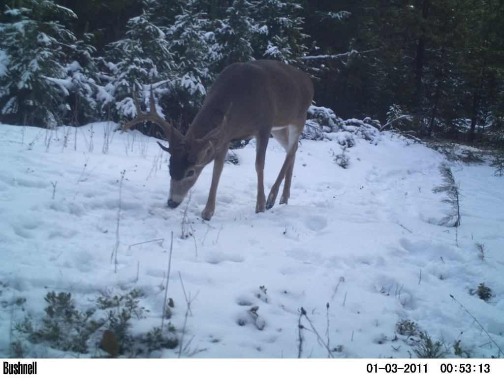 Rutland natives Dave & Pat (Anderson) Kulzer sent in a report on some interesting critters in their back yard. They live in the Swan River Valley, on the west slope of the Rocky Mountains, about halfway between Kalispell and Seelye Lake. Pat reports that they hit the jackpot of big animal pics from one of their trail cameras. “The buck pics are from Dec 5, 2020 about 1 pm, and the bear from Dec 6, 2020 about 2 am. We think the bear is a grizzly. What do you think? Dave counts 5 pts each side on the heavy, wide rack of the buck. The animals were about 150 yards from our house on forest service land just west of the huge old, downed, hollowed-out tree trunk that we call “the bear’s den”. Maybe this griz will decide to hibernate there this winter. Hope not! Most of our snow is gone but today is cloudy and there is light snow in the forecast for several days of the next week. Staying bear aware in Swan Valley, Pat”