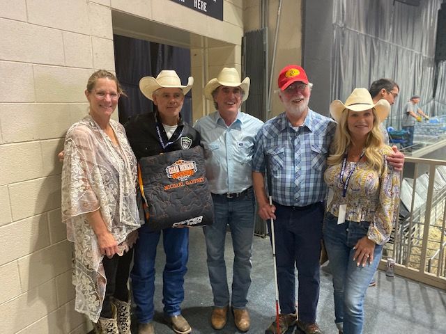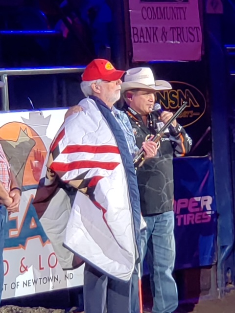 Jesse Brakke, Scott Haan and Bill Anderson were in Bismarck on Saturday & Sunday, June 18 & 19. Paul Anderson also drove over from his Spider Lake cottage near Nevis MN. The 4 local men attended the Professional Bull Riders event at the Bismarck Civic Center, and visited with Paul & Bill’s niece, Kelly Hawkinson, Secretary for the PBR event. Kelly now makes her home near Lewiston MT. Each year, Chad Berger, supplier of the bulls used in the event, honors a North Dakota veteran during the Bismarck PBR program. Unknown to Bill, a Vietnam veteran, Kelly had nominated him to be this year’s honoree. Kelly had arranged for Jesse, Scott, Paul & Bill to receive the VIP treatment at the Bismarck Civic Center before and during the event. About halfway through the event, Mr. Berger, Bill and several others were escorted into the center of the arena for the presentation. It was at this time that Bill figured out that something was up. The announcer read a summary of Bill’s life and military service in the USMC during the Vietnam War, and Mr. Berger presented him with a red, white & blue patriotic quilt and a custom engraved Henry “Golden Boy” .22 caliber lever action rifle.