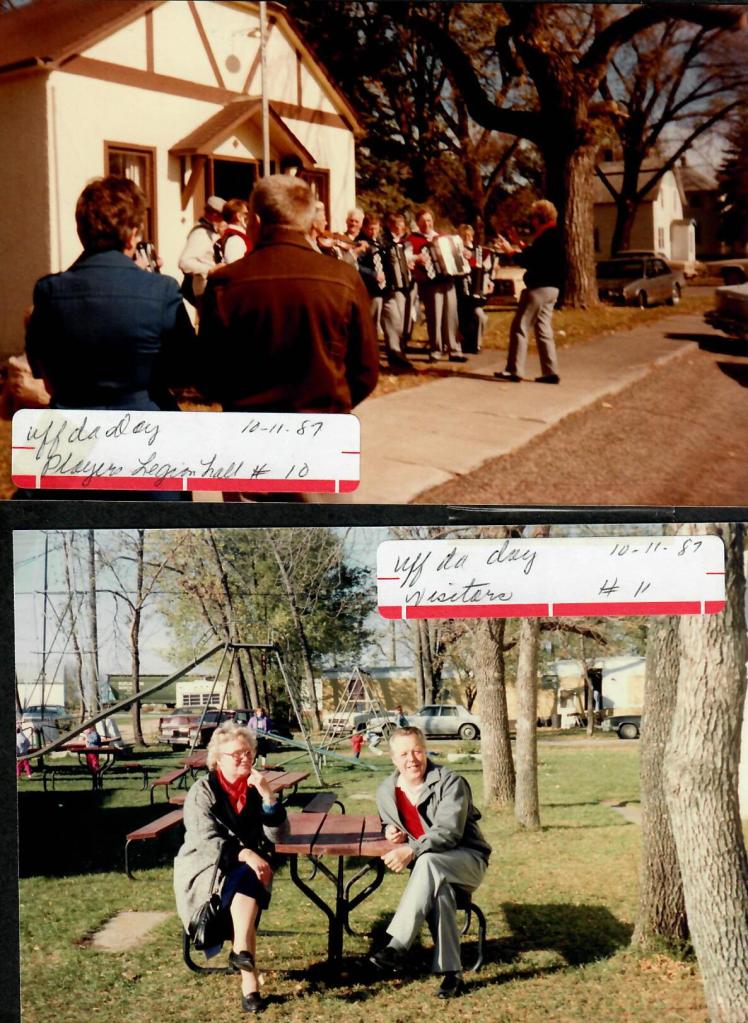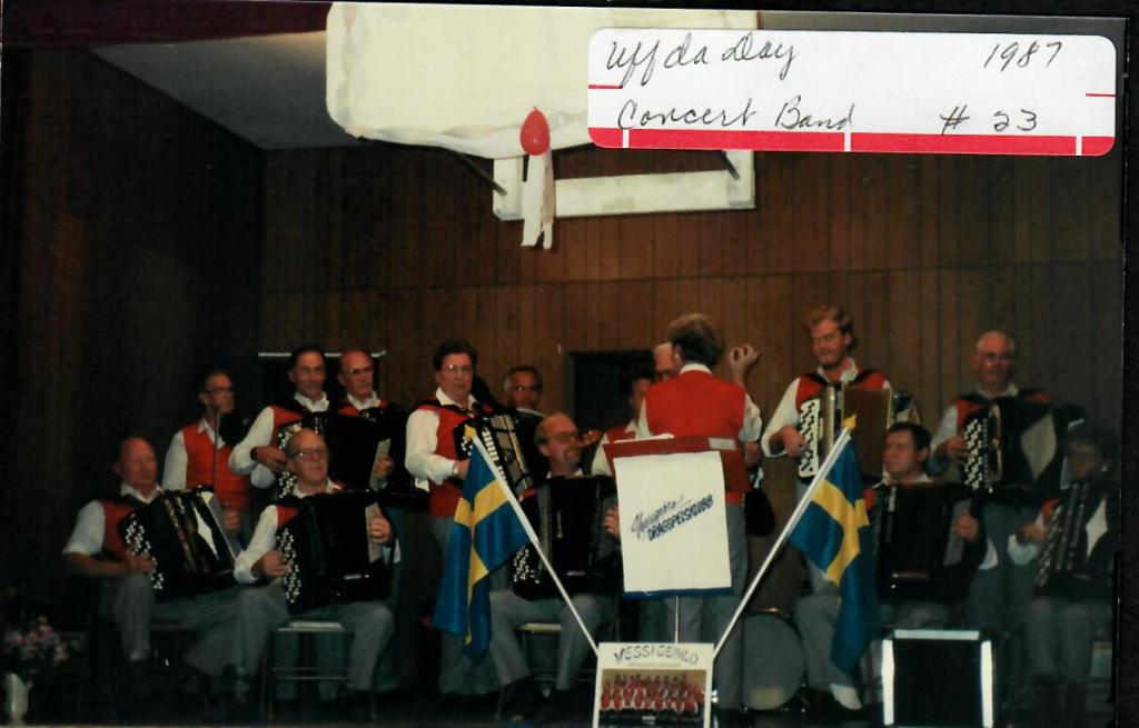 Rutland held its third annual Uff-Da Day on Sunday, October 11, 1987, and it was deemed the most successful to date. Events actually began Saturday evening with a potluck supper and concert. A 53-member orchestra and folk-dance group had arrived earlier on Saturday. Twenty-four of the group were members of the Vessigebro Dragspelklubb (Accordion Club) from Vessigebro, Sweden. The group was on a tour in the three state area as part of a cultural exchange. They performed in New York, Boston and Minneapolis, and were on their way to Fargo and then Minot. Performances were also done on Sunday at the Nordland Lutheran Church and Baptist Church. Members of the troupe stayed through Monday with host families in Rutland.