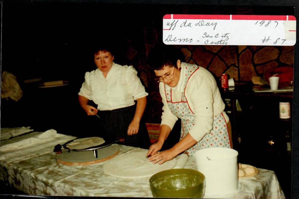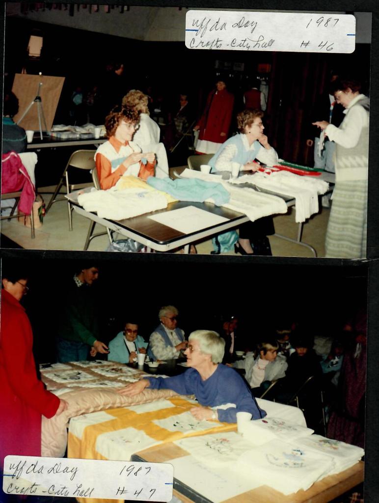 Sunday activities ran from 11 a.m. to 7 p.m. and included live demonstrations of pioneer crafts and ethnic foods, homemade ice cream and butter churning, four different horse and mule-drawn hayrides, the antique quilt display, an antique tractor pull and two more Scandinavian group performances. In addition to the ethnic food sales around town, an escalloped potato and ham dinner was served at City Hall. Ten roasters were consumed along with about 1,300 lefse, 800 rosettes, five roasters of rice pudding, and 12 batches of homemade ice cream (about 500 servings). The abelskievers were a big hit and the crew ran out of ingredients and had to raid their kitchens for more.