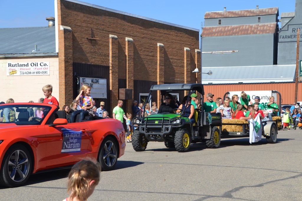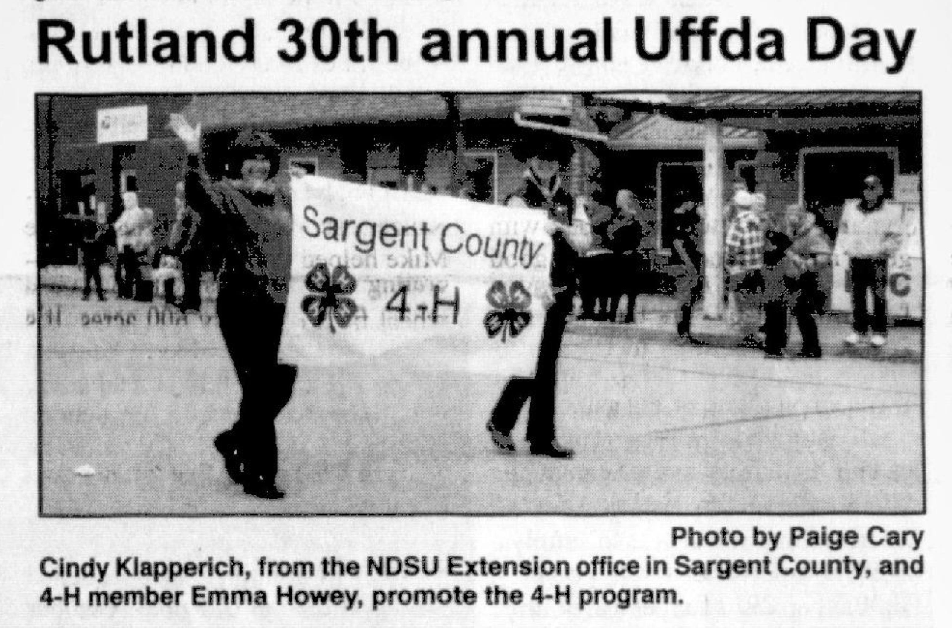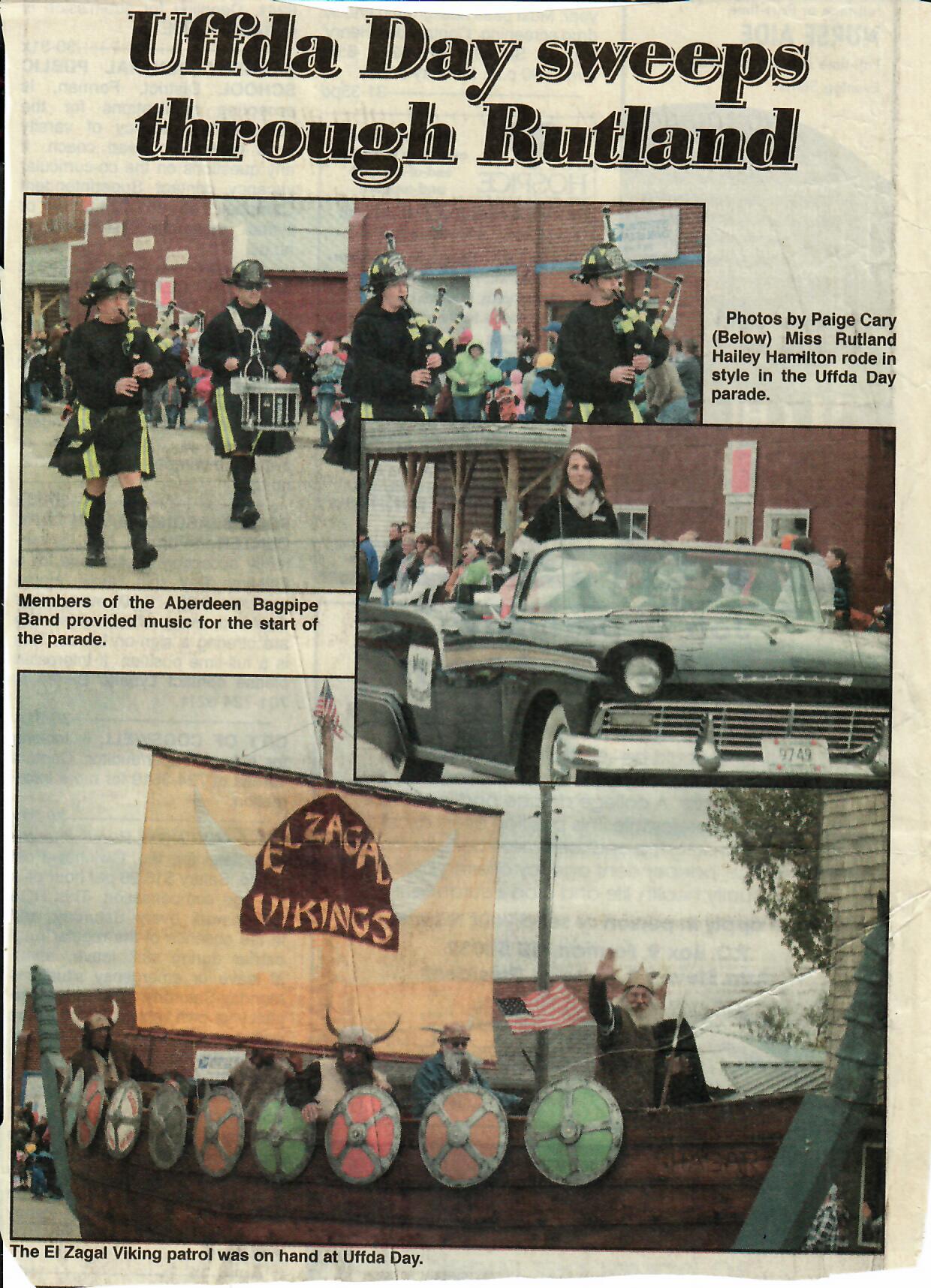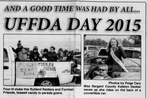 Lefse, live music, scalloped potatoes, rommegrot, rice pudding, sandbakkels, krumkake, rosettes, Uffda tacos and other goods were all available at the Rutland Town Hall, Senior Center, the American Legion Hall and the Rutland Fire Hall. By the time the American Legion Color Guard, Bergman-Evenson Post #215, led the Uffda Day parade down the main street at 1 p.m., another large crowd, estimated to be more than 3,000 , was on hand for the fun. Lowell Wyum had set up his PA system at the corner of First and Arthur Streets to announce the parade entries as they passed by.