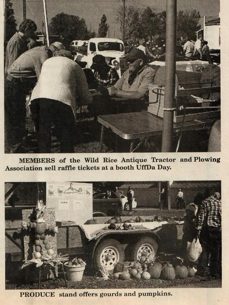 Antique tractors were on display on First Street along with the classic cars ranging from a Model A Ford, circa 1930, all the way up to a 1999 Plymouth Prowler. Demonstrations of tatting, wheat weaving, wool spinning, rope making and corn shelling could also be found. Across the street, the Post Office had a special stamp cancellation all day for visitors to bring home a memento of the day. Homemade ice cream was being served at the laundromat. More than 300 visitors signed the guest register at the Depot Museum. It was another successful Uffda Day.