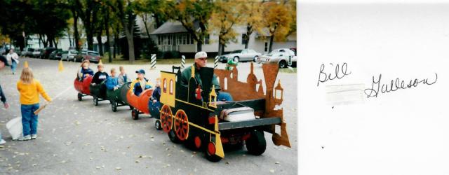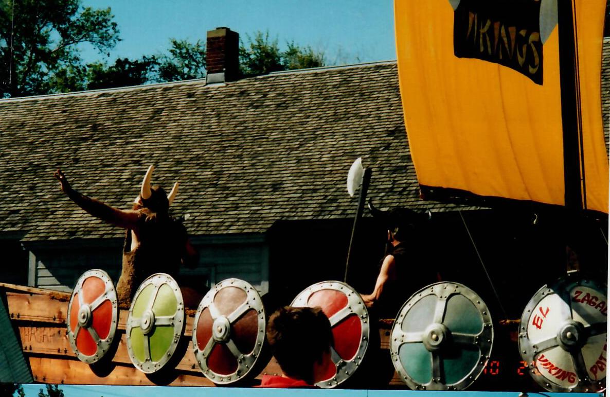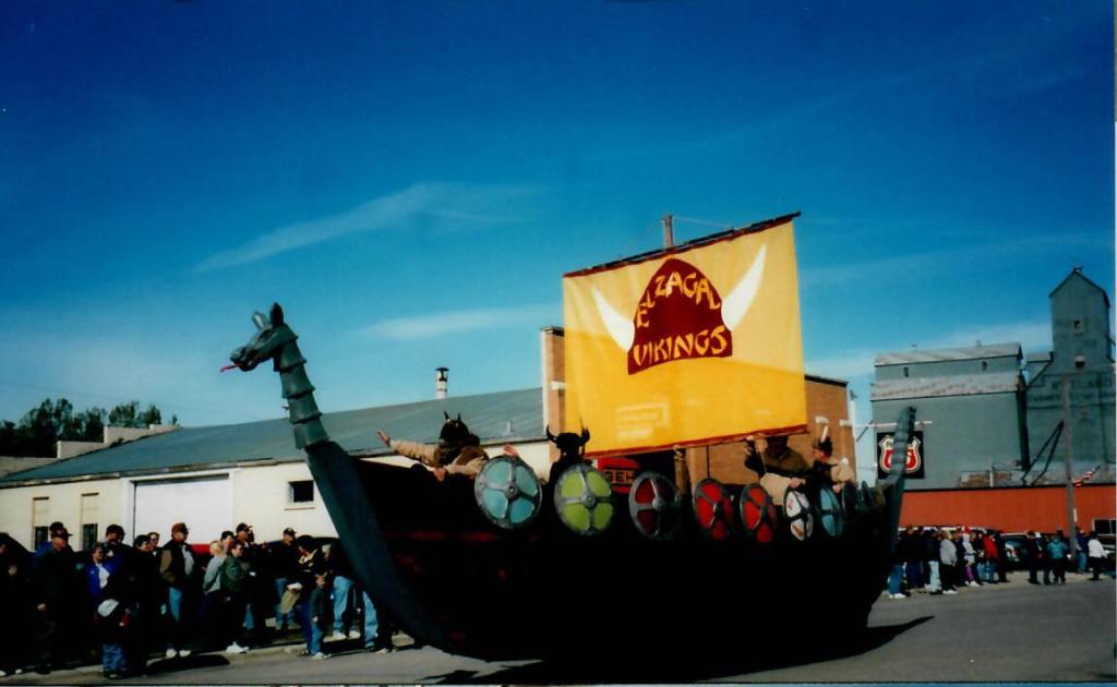 The parade began at noon with a fly over by Rodney Erickson and his boss, Steve Weatherby, in an AT-6 Texan vintage World War II era training plan. The El Zagal Viking Ship floated past parade watchers as did Melroe Bobcats, miniature cars, several parade floats and the Wild Rice Antique Tractor and Plowing Association antique tractors, interspersed among the horse drawn carriages, horses and riders and antique and classic cars.