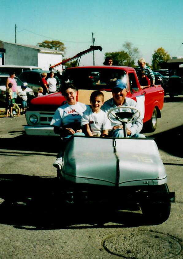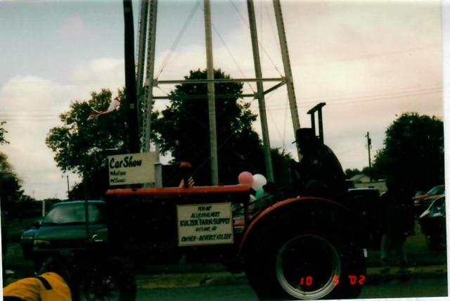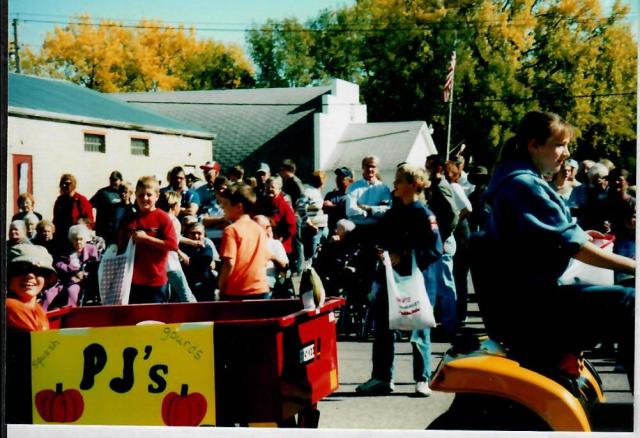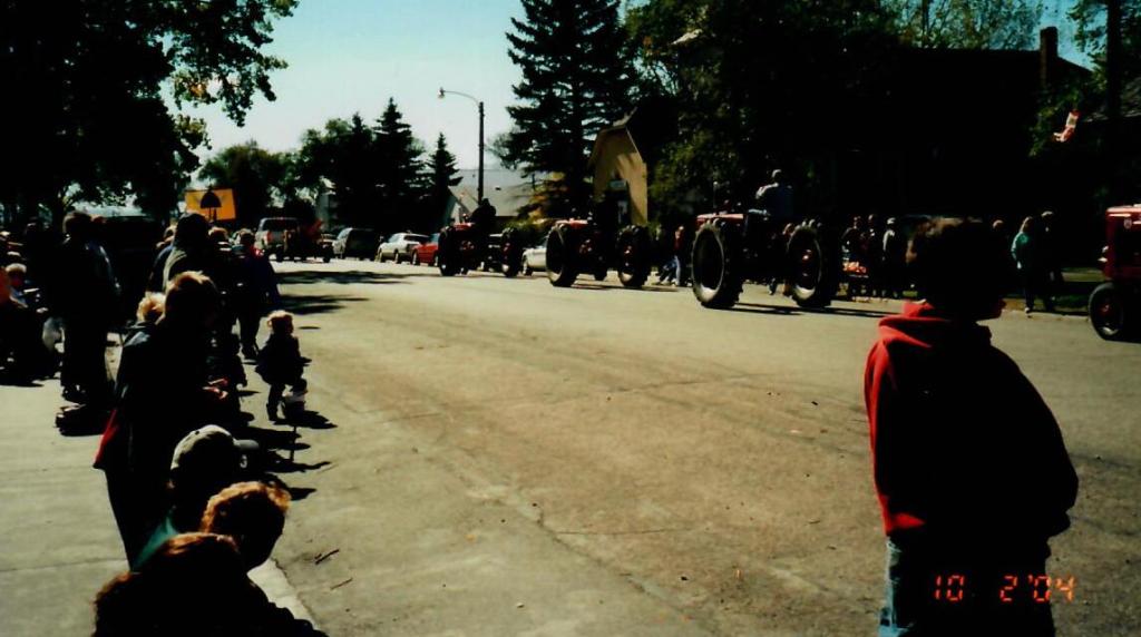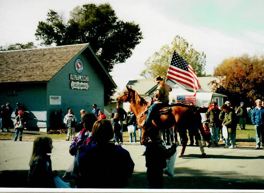 The sun always shines on Rutland even though that’s not what the weatherman predicted for Uffda Day on Sunday, October 5, 2003. A crowd of several thousand, undoubtedly the largest ever in the 19-year history of the event, lined up for the noon parade of more than 90 units that took over 45 minutes to pass by main street where local auctioneer Bill Smith announced them to folks present and Chad Loomis of Lisbon radio station KQLX described them to the radio audience.