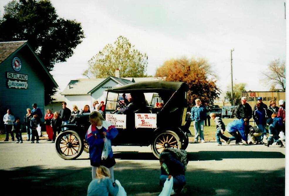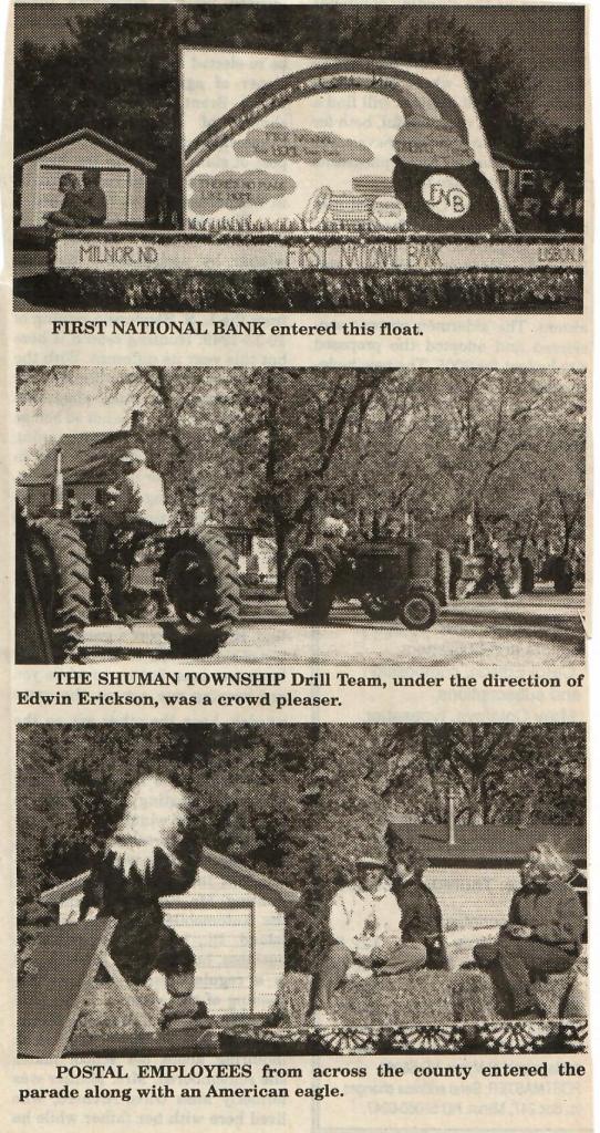 An estimated crowd of more than 3,000 was on hand to view more than 100 units in the parade that started promptly at noon, lead by the Color Guard from Rutland’s Bergman-Evenson Post 215 of the American Legion. Twenty-nine of the 39 young ladies who reigned as “Miss Rutland” from 1960 to 2004 received accolades from the crowd as they wound through the streets of their home town. Borghild Lee, Rutland’s oldest citizen at ag 90, was also a parade participant. Color Guards from the Forman American Legion and VFW Posts and the Lidgerwood American Legion also participated in the parade. Other parade entries were the Wild Rice Antique Tractor & Plowing Association, the Shuman Township Drill Team, classic automobiles, political candidates and many businesses and civic organizations. Dollar Bill Smith announced the parade units to the crow and Terry Loomis of KQLX radio, Lisbon, described the parade to the radio audience.