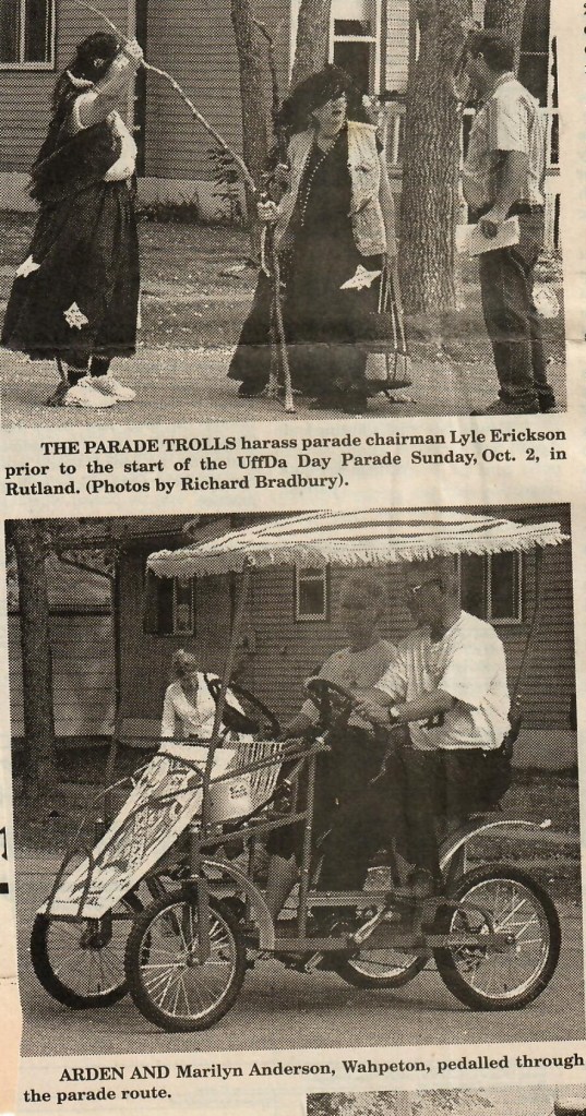 Another record-breaking crowd attended the 21st Uffda Day on Sunday, October 2, lining the streets for the noon parade. Seventy-one units took 35 minutes to pass through town as Dollar Bill Smith announced them and Terry Loomis broadcast the coverage on KQLX radio of Lisbon. By day’s end all the lefse, fattigman, krumkake, rosettes and more than 4,400 lefse that had been prepared and packaged last month, as well as several hundred more made fresh on Uffda Day were gone.