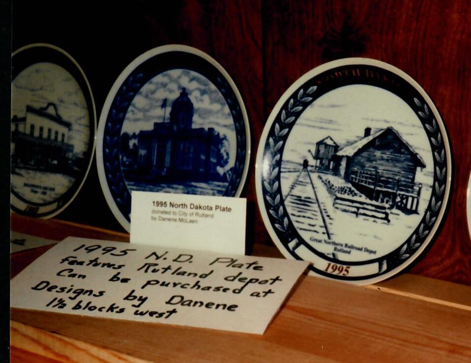 The North Dakota Collector’s Plate for 1995 featured the Great Northern Railroad Depot in Rutland. The blue-and-white china plate series started back in 1972 and each year a different ND landmark was showcased starting with a plate commemorating Fort McKean. Fort Totten to Hatton’s Eielson Museum to the Red River Steamboat in Wahpeton had been on prior issues. The entire collection was displayed at the Museum for Uffda Day. Danene McLaen’s painting of the Great Northern Railroad depot graced the 1995 plate and the plates were available for purchase from Danene at her shop Designs by Danene for $25.00. The 1995 plate remains on display at the Depot Museum.