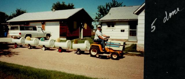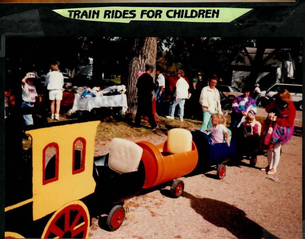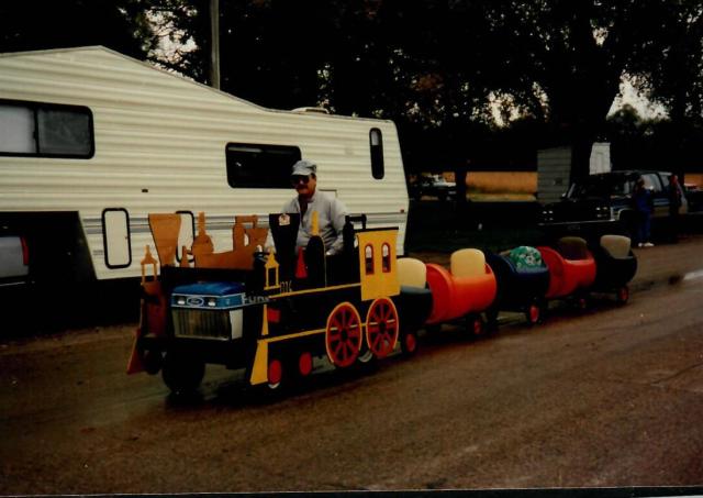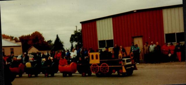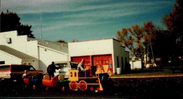 Earl Cramton and Dan Anderson were the engineer and conductor on the brand new Uffda Train which provided entertaining transportation for small children throughout the afternoon. Ronnie Narum, Earl and Dan spent a few weeks building and painting the new ride for Uffda Day.