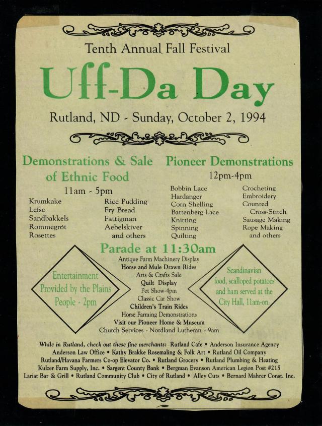 A large and exuberant crowd, estimated at 3,500, gathered in Rutland, Sunday, October 1, 1995, for the 11th annual Uffda Day. The weatherman cooperated by providing a beautiful Sunday. The 50 unit parade at noon kicked off the day’s events. Auto buffs exhibited their prized possessions in the classic car show and antique tractors plowed in farming demonstrations on the southwest corner of town.