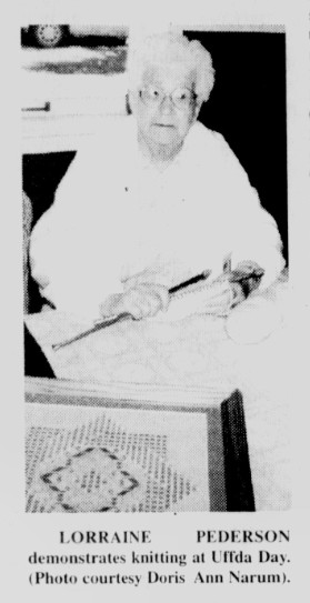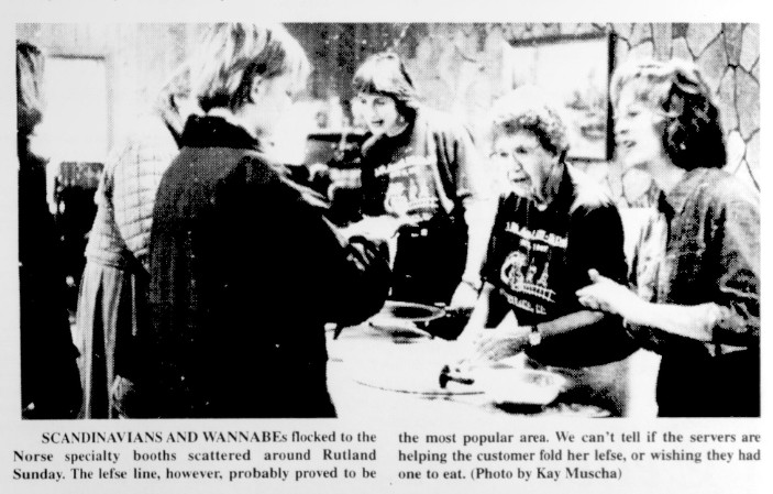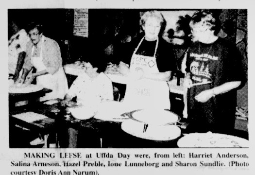 During the day the crowd consumed 4,000 lefse as well as a large quantity of sandbakkels, krumkake, rommegrot, rosettes and other Scandinavian fare. Those enjoying the scalloped potato dinner at the hall or having lunch at the Senior center were entertained by a variety of musicians, including accordionist Gundy Dahlen of Telemark, Norway.