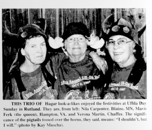 Doris Ann Narum had reported years ago that one of her Uffda Day notebooks had been ‘borrowed’ by someone attending Uffda Day in the 1990s. There is no trace of photographs for Uffda Day for the last three years of the 1990s. If you have found the album in your family belongings, feel free to drop it off at Uffda Day this year so that the Rutland Community Club can reclaim the history that has been lost.