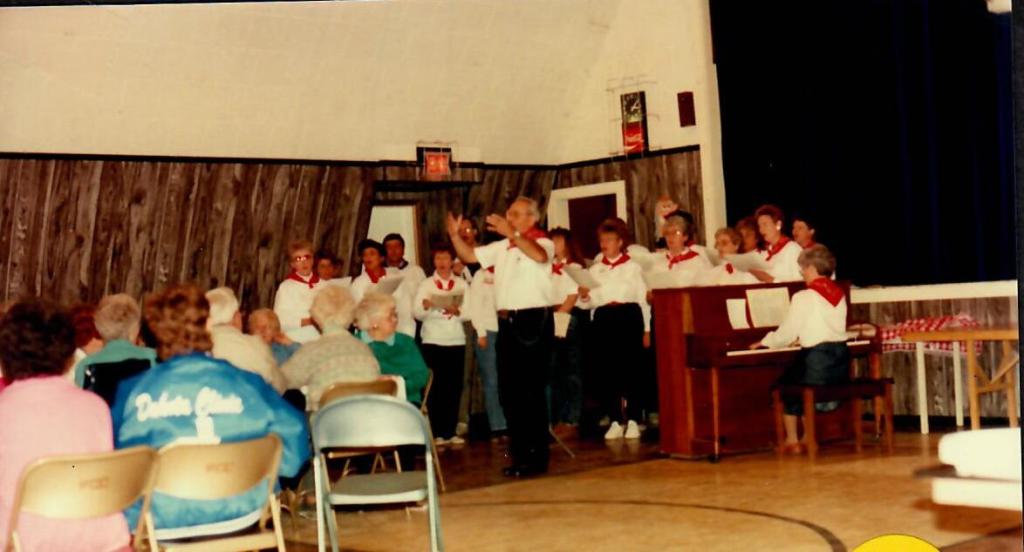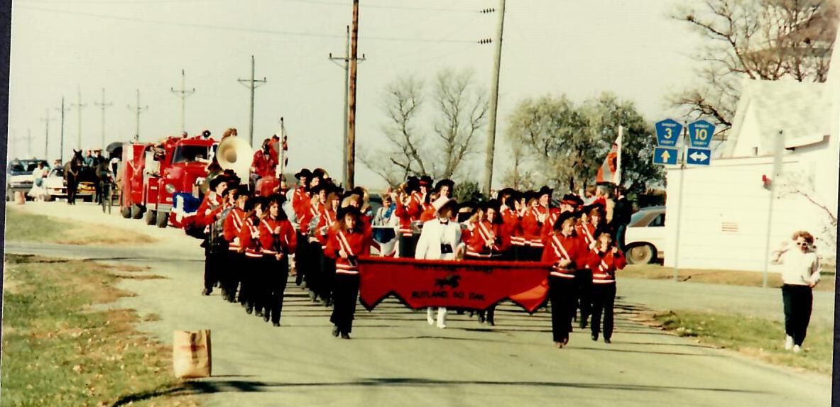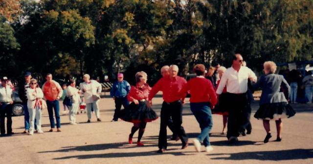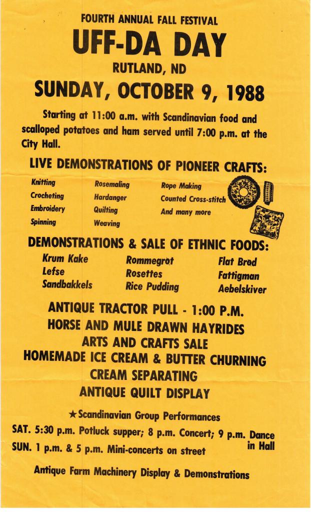 In May of 1989, the Community Club made the decision to move Uffda Day to the first weekend in October and planning began. The event would also be part of the Rutland State Centennial Celebration on Sunday, October 8, 1989. Events actually began on Saturday evening with a potluck supper at the Hall. The Centennial Chorus from Rutland, South Dakota, entertained the supper crowd with several old favorites. They were followed by a medley of songs from the Norwegian musical team of Arneson and Lindbo then entertained with dance music old and new.