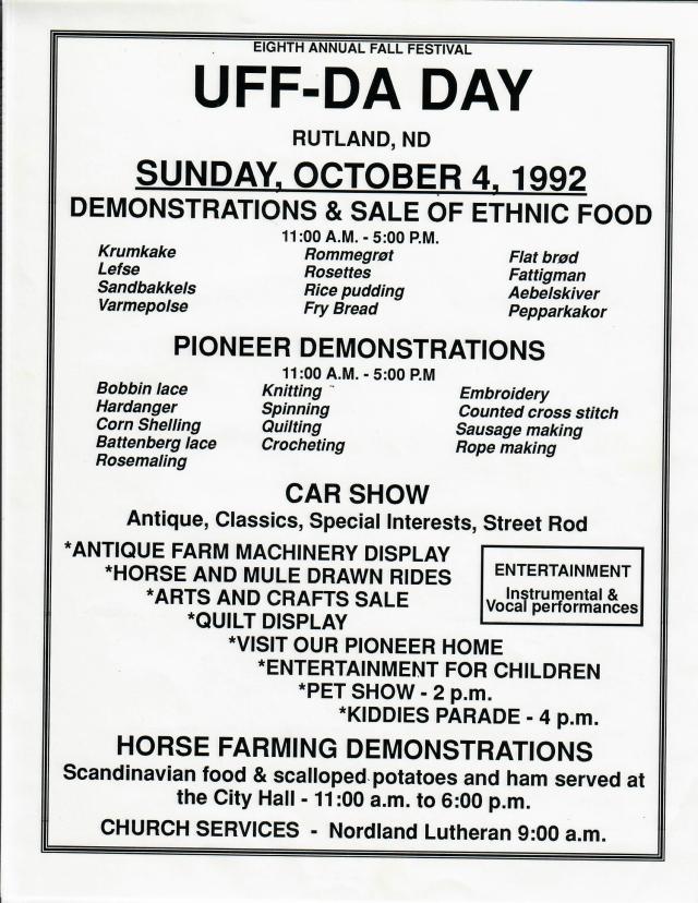 Rutland’s 7th annual Uffda Day on Sunday, October 6, 1991, drew a record crown with an estimated 850-900 eating at the Hall alone.