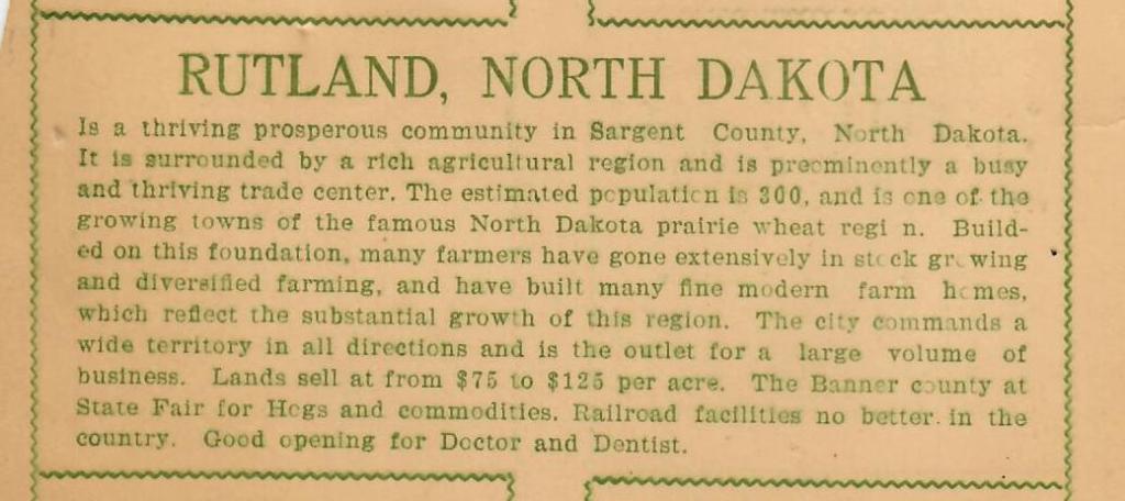 A 1920 Pocket Directory of Rutland North Dakota was printed compliments of several Rutland business firms that also advertised in the Directory. The Businesses who advertised included Martin John Vulcanizing & Retreading; the City Billiard Hall, candies cigars tobaccos and soft drinks, R.M. Peterson Prop.; John R. Jones Lumber Farm Implements and Fuel; Geo. E. Hansen, City Barber Shop, home of toilet articles and face creams; the City Opera House, Billiards and Bowling, John Bloomdale Prop.; Columbia Restaurant, Meals-Lunches Home Cooking, Mrs. John Jones, Proprietor; the Rutland Garage & Repair Co. , Theo. Helberg and Paul Kuester; Rutland Farmers Co-Operative Co., E.J. Hoel, Manager; Green Brothers Corporation; First State Bank; Edward Benson, general merchandise; the Rutland Meat Market, C.W. Barger, Proprietor; Farmers Co-Operative Store, J.W. Johnson, Manager; and Johnsons Cash Store.