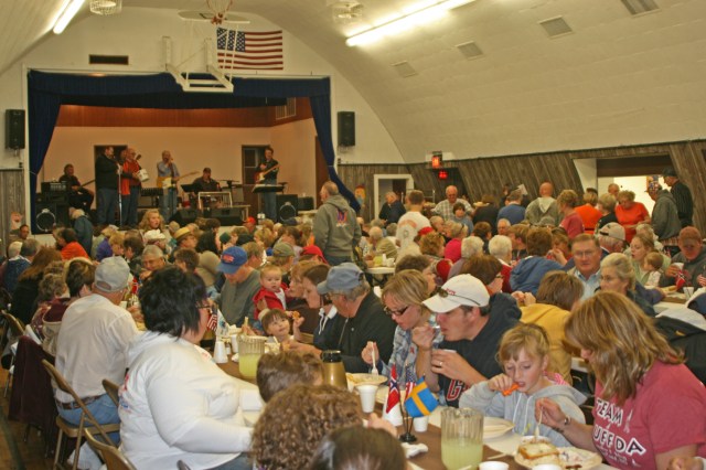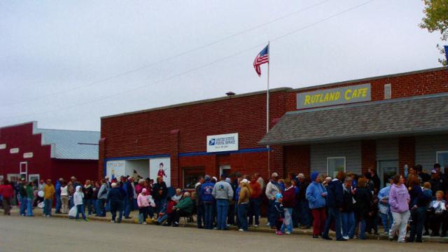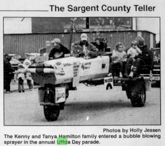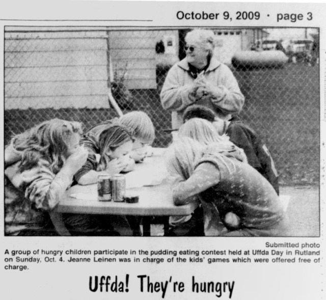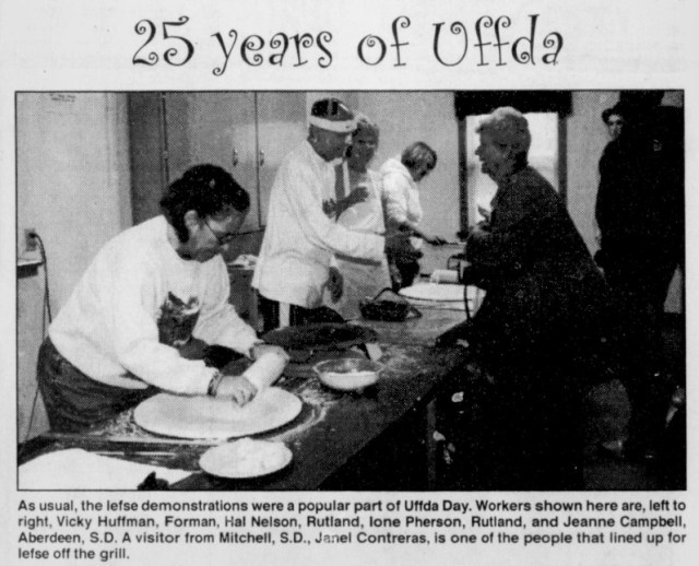 Lefse, live music, scalloped potatoes, rommegrot, rice pudding, sandbakkels, krumkake, rosettes, Uffda tacos and other goods were all available at the Rutland Town Hall, Senior Center, the American Legion Hall and the Rutland Fire Hall. By the time the American Legion Color Guard, Bergman-Evenson Post #215, led the Uffda Day parade down the main street at 1 p.m., another large crowd, estimated to be more than 3,000 , was on hand for the fun. Lowell Wyum had set up his PA system at the corner of First and Arthur Streets to announce the parade entries as they passed by.